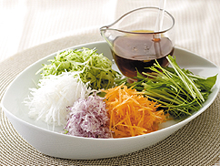 お好みの野菜をスライサー等で千切りにして、きらさん万能ドレッシングをたっぷりかけていただきます。