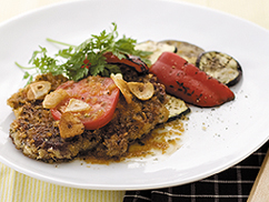 (3)豚ローススライスに塩胡椒をふり、パセリを混ぜたパン粉をついえ、オリーブオイルを多めに入れたフライパンで両面をソテーする。(A)の付け合せの野菜も一緒に焼く。